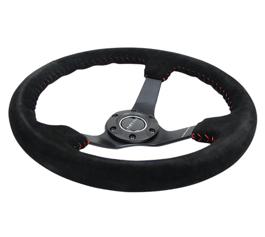 NRG Reinforced Steering Wheel (350mm / 3in. Deep) Blk Suede/Red BBall Stitch w/5mm Matte Blk Spokes