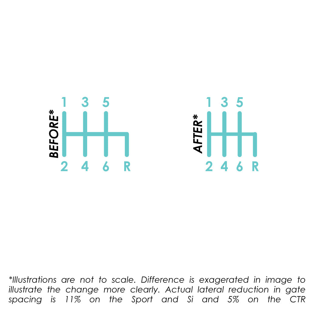 On the Civic Si and Sport models, this Shifter Rocker Upgrade will reduce gate spacing by approximately 11% and will stiffen the lateral action of the shifter. Additionally, stiffness in the left/right motion will increase, feeling more rigid, and free play in the left/right direction will be reduced.