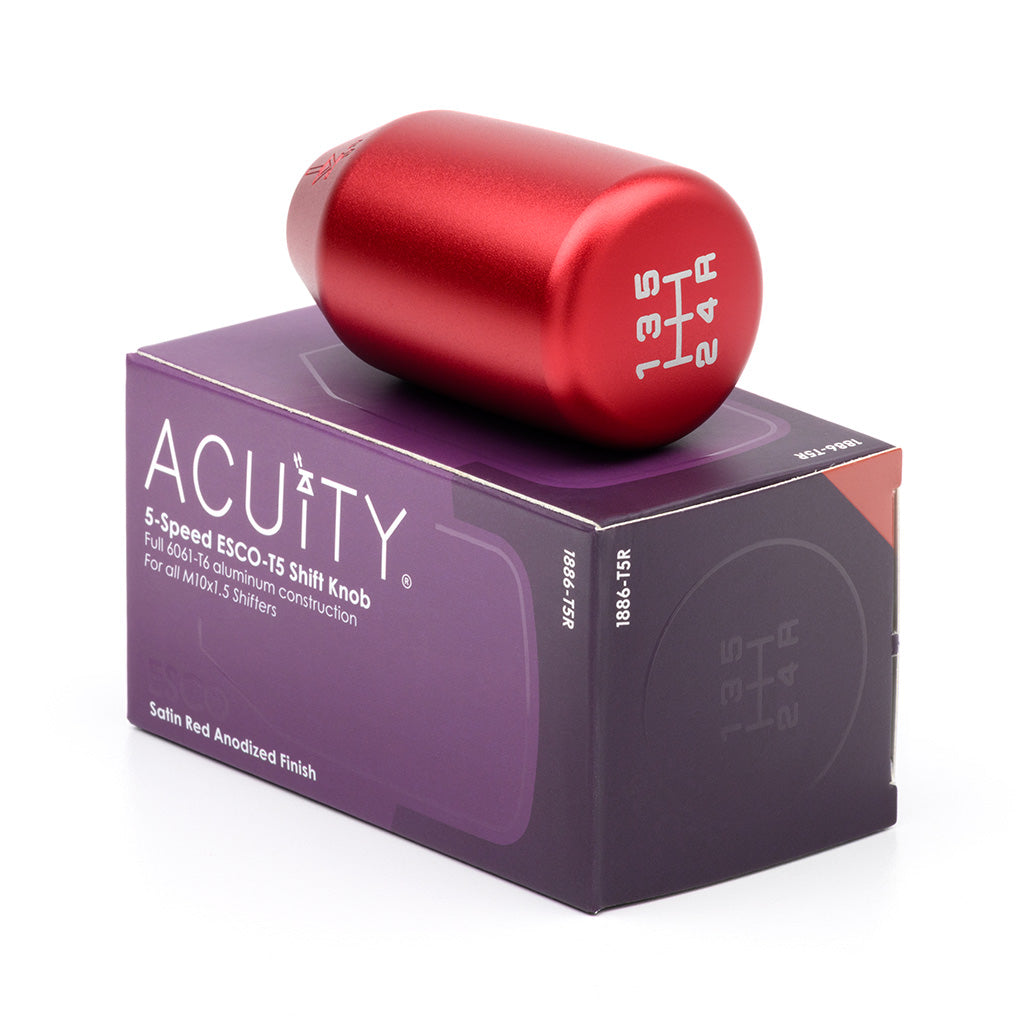 ACUiTY's ESCO shift knob design is quickly becoming the preferred driver's knob due to its carefully crafted profile. This ESCO-T5 shift knob maintains that popular shape and features full 6061 aluminum construction, a beautiful satin red anodized finish, and a laser-etched 5-speed Honda/Acura gear pattern. The final appearance is both simple and classic. With its 40mm barrel-shaped upper portion, gently domed top, and tapered bottom, the ESCO-T5 fits beautifully in most drivers' hands. While spherical knobs have become popular, the truth is they allow a lot of grip variation when changing gears. By forcing a more consistent hand position through its unique shape, the ESCO-T5 helps to train muscle memory, making shifts more consistent.