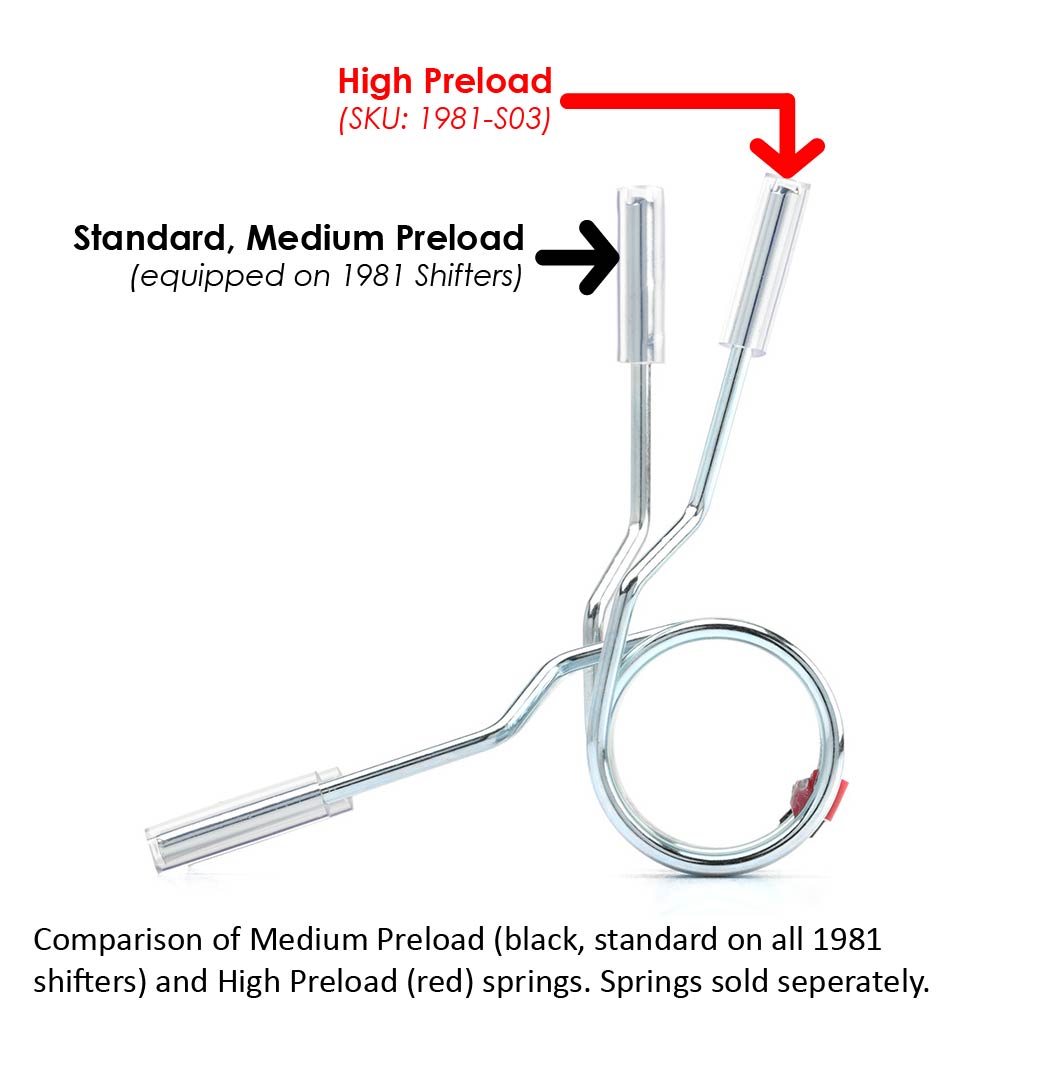 If you’re instead looking for a spring that provides a lower preload and gentler centering than what the shifter came equipped with, consider instead opting for SKU 1981-S01 which has a 15% lower preload than the spring equipped to 1981 shifters.