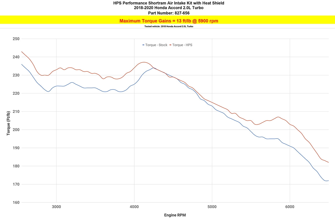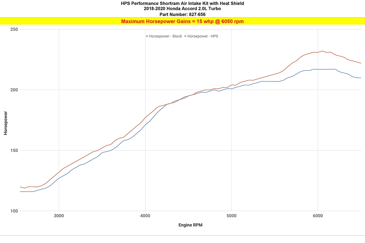 The All-New HPS Performance 827 Series Air Intake Kit (Black, Part # 827-656WB) for 2018-2020 Honda Accord 2.0L Turbo offers a free-flowing 3 inch mandrel-bent aluminum tube induction system designed to produce dyno proven performance gains +15 Whp horsepower, +13 Ft/lbs torque and improve throttle response while maintaining safe air fuel ratio. The heavy duty powder coated steel heat shield integrates with the factory fresh air scoop to direct cold air to the air filters for the best cooling effect. The included installation manual has clear pictures and instructions to guide the installer throughout the whole process. The kit does NOT require tuning and does not trigger CEL light. No modification is required during the installation. HPS light weight mandrel-bent aluminum alloy tubes replace the stock restrictive air box and optimize the air flow with long lasting durability. HPS Performance 827 Series air intake kit features race proven reinforced silicone hoses and industrial grade 100% stainless steel T-bolt clamps which ensures reliability, even during the most extreme driving conditions. The All-New HPS Performance Air Filter is designed with performance in mind, delivering excellent filtration without sacrificing air flow. All HPS Performance Air Filters are made in the United States.