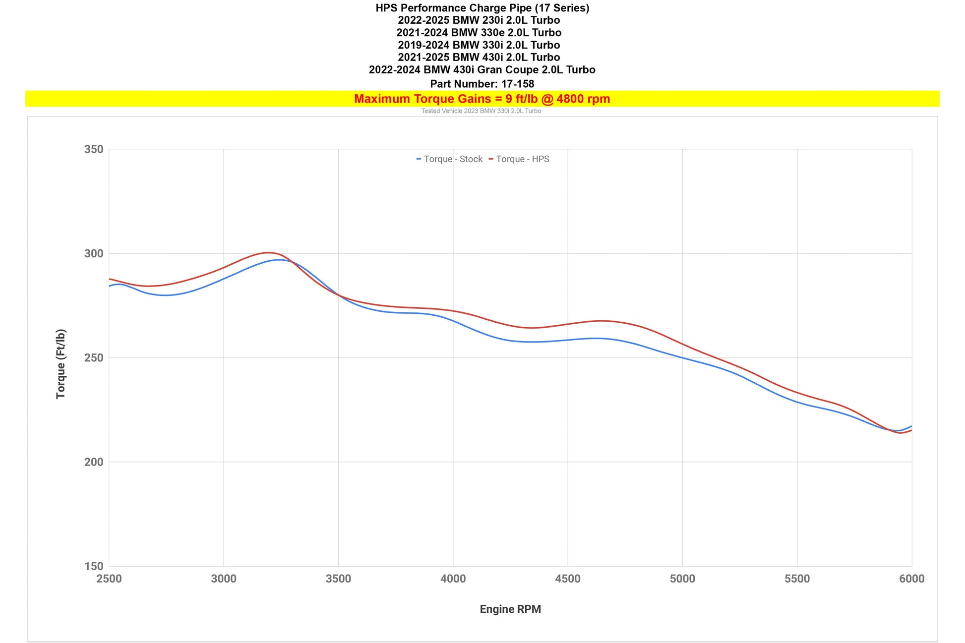 The HPS Performance Charge Pipe Kit is engineered to give your BMW a thrilling boost in power and responsiveness by delivering dyno-proven gains of additional 8.3 horsepower and 9 lb-ft. of torque. Crafted with superior materials, this charge pipe kit features smooth 3" bead-rolled aluminum piping that surpasses the stock plastic piping in both performance and durability. This two-piece design provides users a struggle-free installation experience. The high-temperature and high-pressure resistant 3-ply reinforced silicone hump coupler in the kit ensures a secure and long-lasting connection, while the 100% stainless steel embossed hose clamps guarantee a leak-free installation. Designed as a direct replacement for the stock piping, this kit seamlessly integrates into your BMW's engine bay without requiring any additional modifications or tunes. The convenient 1/8" NPT bung allows seamless integration for additional accessories, while the billet aluminum quick connect adapter streamlines the installation process. Experience the perfect blend of performance, durability, and ease of installation with the HPS Performance Charge Pipe Kit. Whether you’re taking your BMW out on the track or cruising the streets, this upgrade is a must if you’re looking to enhance your drive.