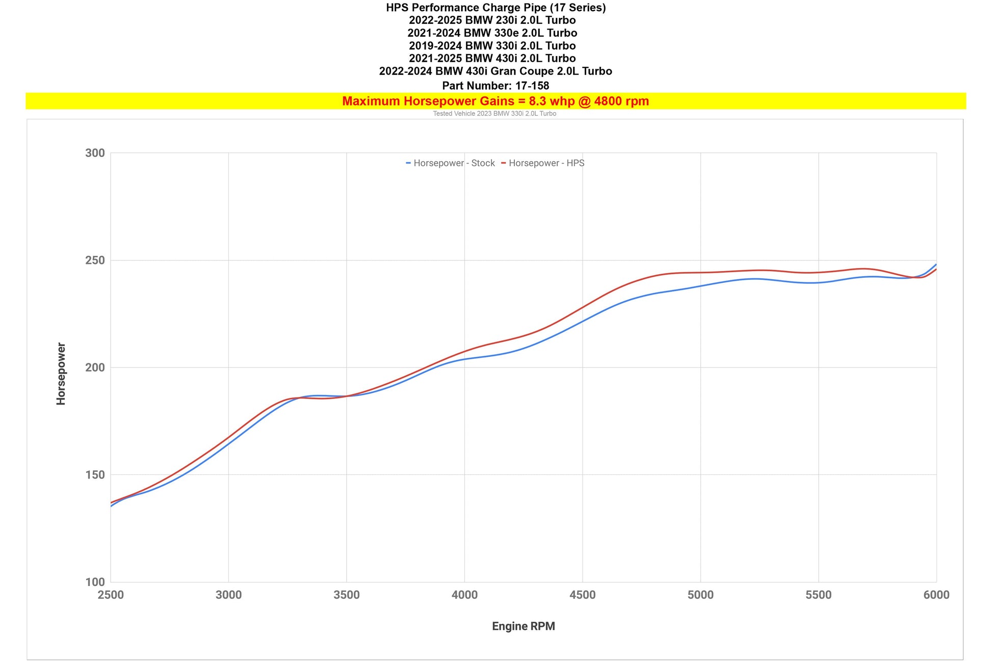 The HPS Performance Charge Pipe Kit is engineered to give your BMW a thrilling boost in power and responsiveness by delivering dyno-proven gains of additional 8.3 horsepower and 9 lb-ft. of torque. Crafted with superior materials, this charge pipe kit features smooth 3" bead-rolled aluminum piping that surpasses the stock plastic piping in both performance and durability. This two-piece design provides users a struggle-free installation experience. The high-temperature and high-pressure resistant 3-ply reinforced silicone hump coupler in the kit ensures a secure and long-lasting connection, while the 100% stainless steel embossed hose clamps guarantee a leak-free installation. Designed as a direct replacement for the stock piping, this kit seamlessly integrates into your BMW's engine bay without requiring any additional modifications or tunes. The convenient 1/8" NPT bung allows seamless integration for additional accessories, while the billet aluminum quick connect adapter streamlines the installation process. Experience the perfect blend of performance, durability, and ease of installation with the HPS Performance Charge Pipe Kit. Whether you’re taking your BMW out on the track or cruising the streets, this upgrade is a must if you’re looking to enhance your drive.