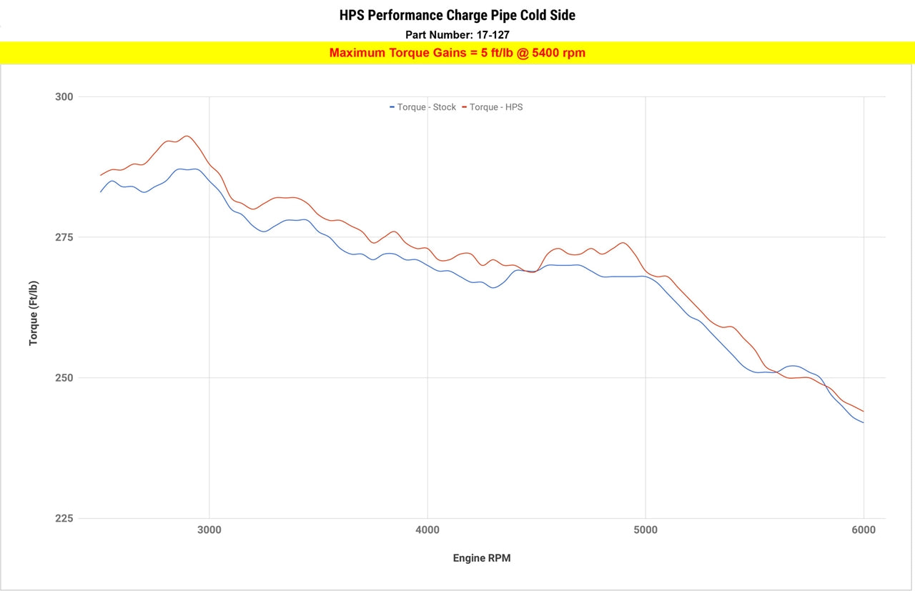 The HPS Performance Cold Side Charge Pipe Kit features an aluminum charge pipe that incorporates a billet CNC quick connect flange to eliminate known failure points on your vehicle's stock components. This kit includes a high-temperature and high-pressure resistant, 4-ply reinforced silicone coupler and heavy duty 100% stainless steel T-bolt clamps to provide a secure and leak-free connect to the intermediate intercooler pipe. It also includes a brand new replacement O-ring for the throttle body connector as the stock ring is known to deteriorate over time. Alongside durability, this charge pipe delivers dyno-proven gains of 5 horsepower and 5 lb-fts. of torque for improved throttle response and reduced turbo lag. The charge pipe also includes a 1/8" NPT bung to give you the option of running methanol injection or boost gauges (even nitrous systems). Installation can be completed in under 30 minutes with basic hand tools and does not require any additional modifications or a ECU reflash. Don't end up stranded due to a broken charge pipe. Replace your old and damaged plastic cold side charge pipe with the upgraded HPS Performance Cold Side Charge Pipe.