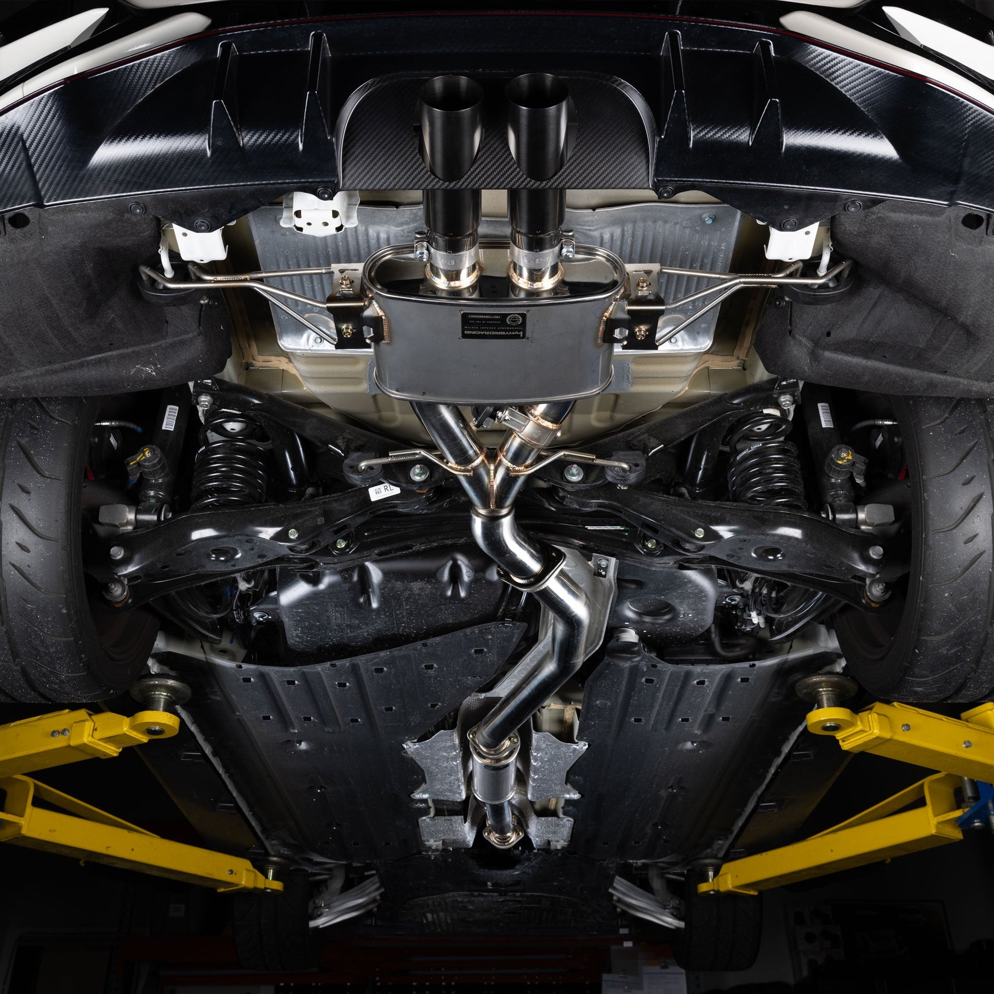 The Hybrid Racing Formula exhaust system goes beyond just enhancing the car's performance; its design refines the Civic's aesthetics. An integral part of this transformation is the inclusion of a dry-carbon fiber rear valence. This addition elevates the car's appearance and streamlines the rear bumper. The valence is a testament to our commitment to eliminating the factory's triple-tip design and replacing it with a sleeker, more race-inspired system.