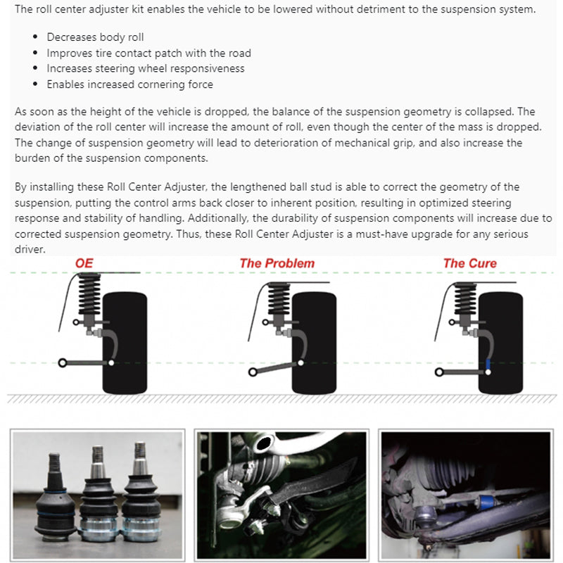 By installing these Roll Center Adjuster, the lengthened ball stud is able to correct the geometry of the suspension, putting the control arms back closer to inherent position, resulting in optimized steering response and stability of handling. Additionally, the durability of suspension components will increase due to corrected suspension geometry. Thus, these Roll Center Adjuster is a must-have upgrade for any serious driver.